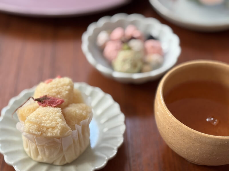 Simple steamed bread made with rice flour. Steamed with salted cherry blossoms on top.