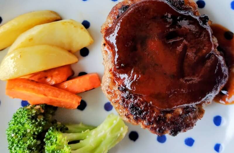 A main dish, humburg steak, is a seasoned patty of grated meet, blended with brearcrums, onion, and egg, then panfried -something every Japanese person is familiar with.