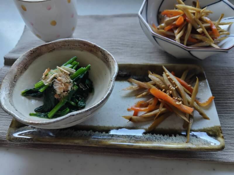 spinach ohitashi (lightly seasoned boiled spinach) and kinpira gobo (stir-fried burdock root and carrot).