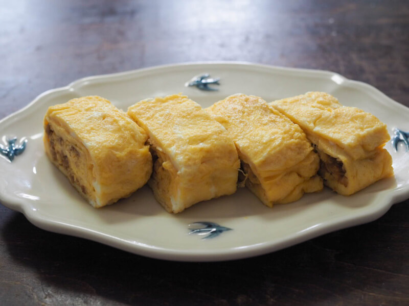 Dashimaki tamago is a soft Japanese rolled omelet made with eggs and dashi broth.