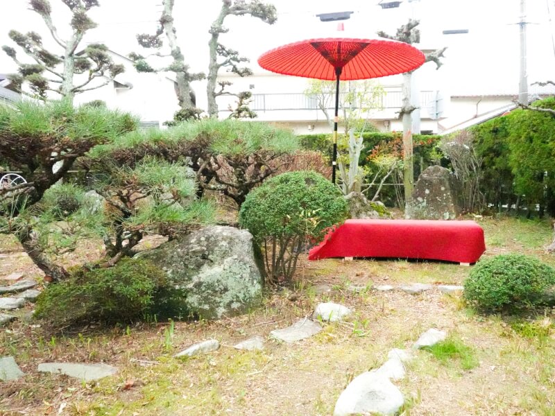 After cooking, we will move to a traditional Tatami room. You can enjoy your self-made lunch served on authentic, antique Japanese tableware, while looking out at a beautiful Japanese garden. (Don't worry about sitting on the floor—we provide comfortable high chairs and tables!). Finally, enjoy a photo session in the garden with a traditional red umbrella (Nodategasa).