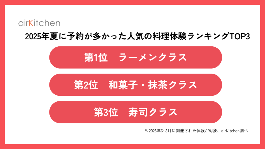 NHKでも紹介されたairKitchenが、2025年6月〜8月に特に多く予約された人気クラスTOP3を発表!
